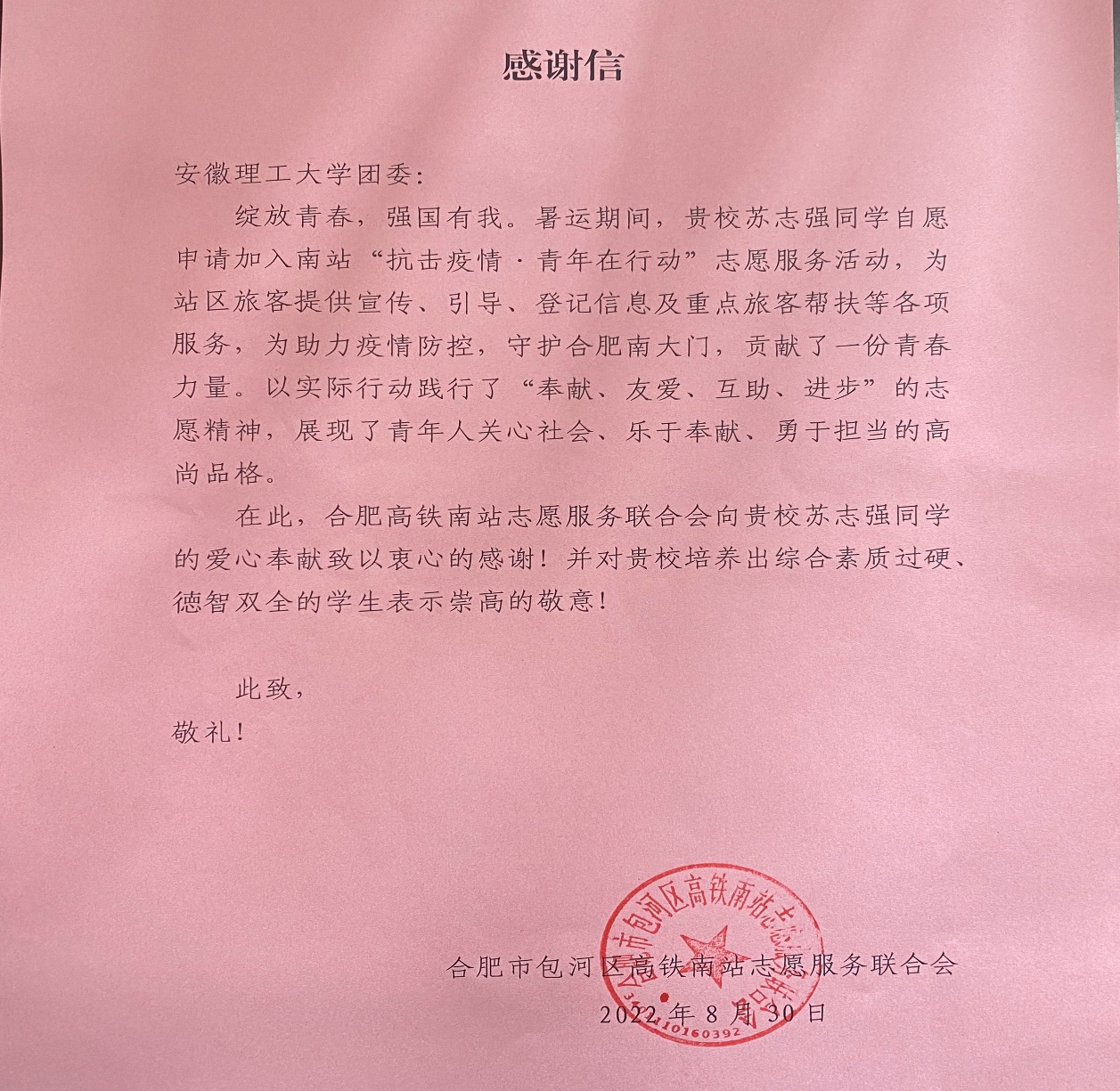 近日,合肥市高铁南站志愿服务联合会给足球心水论坛 寄来了一封感谢信,感谢足球心水论坛 2021级交通工程专业的苏志强同学,在2022暑期奋战抗疫一线,顶高温、冒酷暑,为筑牢疫情防线,打赢疫情防控阻击战贡献了青春力量,彰显了足球心水论坛 学子的责任与担当。