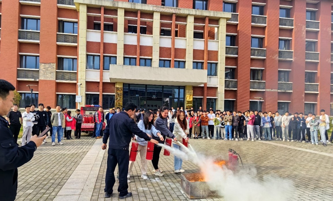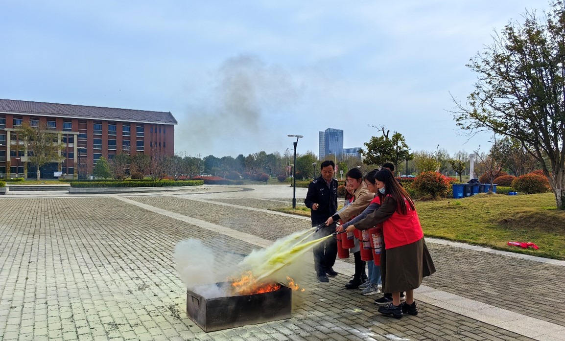 师生到达室外安全区域后,在校保卫处工作人员指导下依次体验了灭火器的操作使用方法,进行了灭火演练。