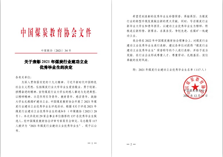 校友高理鹏获评“2021年煤炭行业建功立业优秀毕业生”