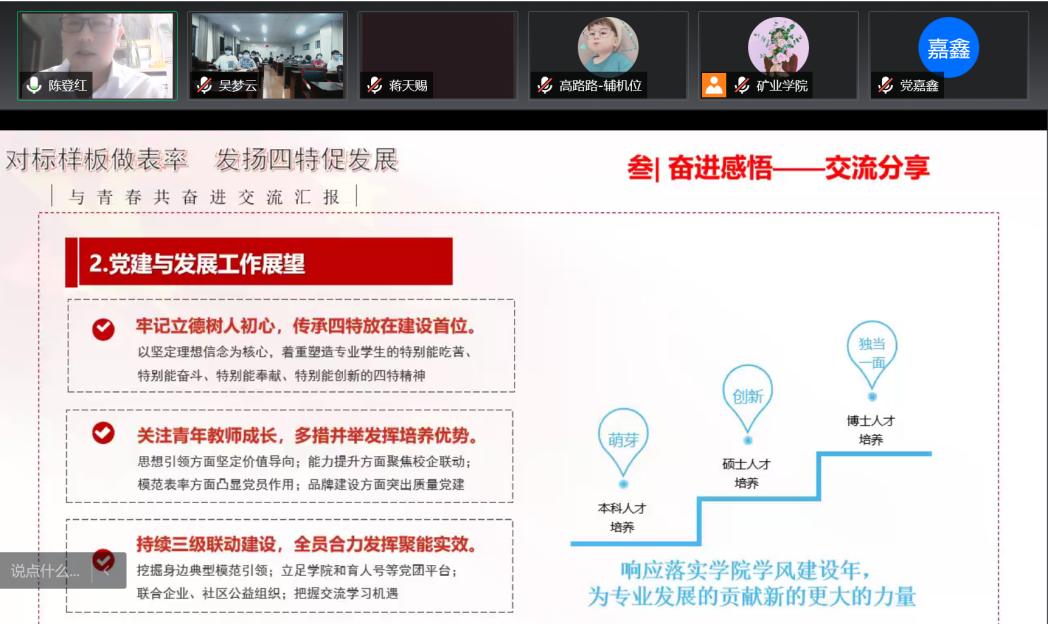 为加强教工党支部与学生党支部的交流联系,贯彻落实立德树人根本任务和足球心水论坛 学风建设年具体举措,5月4日晚,足球心水论坛 采取线上线下相结合的方式举办样板党支部与学生党支部“青春共奋进-榜样引领”主题交流活动。活动由采矿工程系教工党支部书记陈登红主持并主讲,30名学生党员线下参会,80名学生党员线上参会。