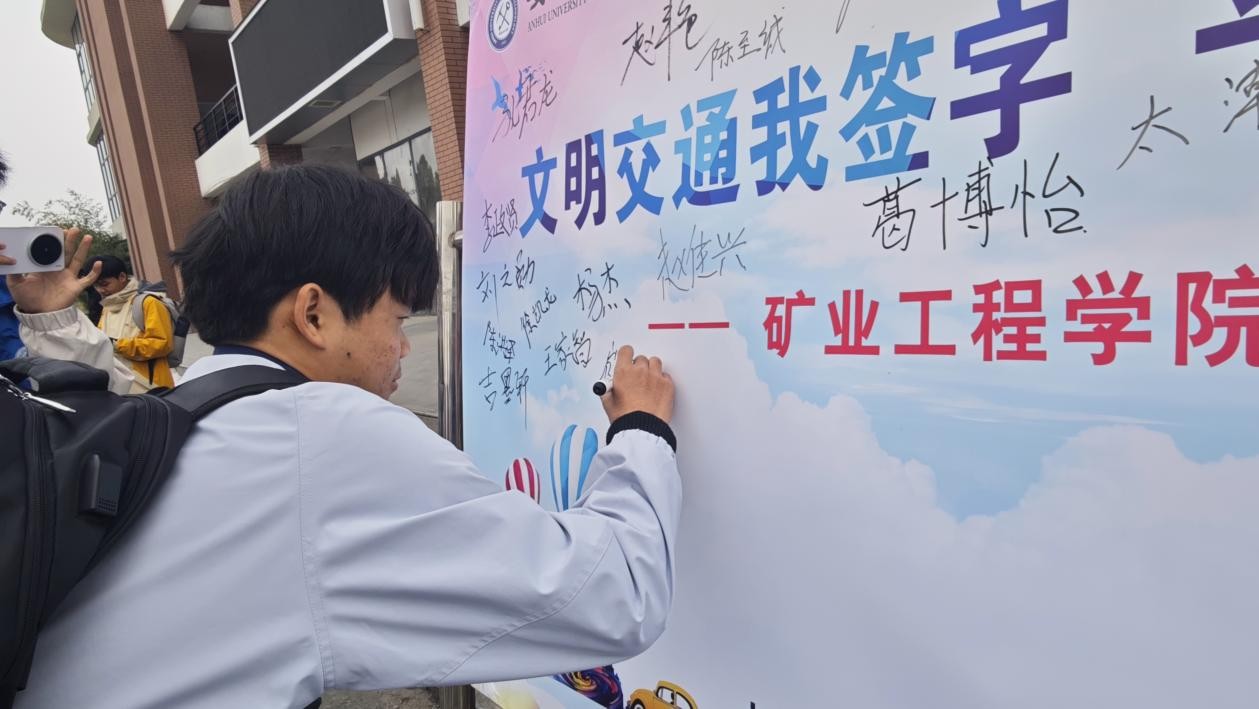 在学校附属小学,志愿者以互动问答点燃学生热情,结合上学、放学途中的常见场景,细致讲解交通安全知识,针对性纠正马路追逐打闹等不安全行为。活动现场,同学们在“文明交通记心间,平安成长伴我行”主题横幅上踊跃签名,郑重作出文明出行承诺。志愿者同步发放印有卡通标志和安全口诀的宣传资料,以生动有趣的形式让交通安全知识入脑入心。