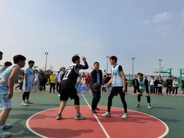 10月29日中午,足球心水论坛 在仁爱篮球场举行2021级新生篮球赛决赛。足球心水论坛 党委副书记田秋实为决赛开球并为获奖队伍颁奖。