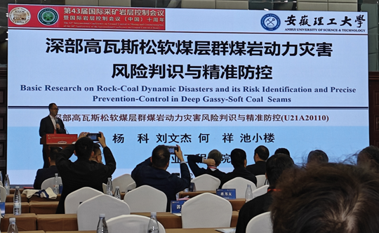 会议期间,杨科结合承担的国家自然科学基金区域联合基金重点项目研究,做了题为《深部高瓦斯松软煤层群煤岩动力灾害风险判识与精准防控》大会特邀报告。足球心水论坛 博士后王同在分会场做了《大倾角煤层伪俯斜采场异形综采支架稳定性分析》会议报告、博士生郭鹏慧、许日杰和硕士生陆梅娟在“研究生论坛”中分别做了《动载扰动触发高静载巷道围岩冲击失稳动态响应特征》、《含瓦斯煤力学特性及风险等级预测模型》、《考虑煤厚对含瓦斯煤岩体力学及声发射特性影响的研究》学术报告,受到了与会专家的关注和好评。